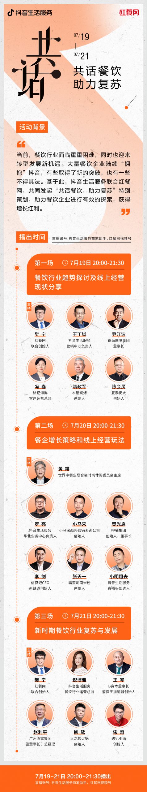 本次“共話餐飲·助力復蘇”圓桌論壇,抓住當前環境下餐飲企業的諸多隱痛,走近餐飲品牌,與餐飲人共話,為餐飲企業賦能,助力餐飲行業升級轉型,探索復蘇新機遇。歡迎大家在7月19日—7月21日20:00-21:30,鎖定抖音生活服務商家助手抖音號和紅餐網視頻號,與嘉賓互動,共話餐飲。