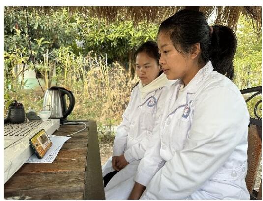 (云南省瀾滄縣巖因村鐘麗萍醫生與同事在線上觀看新冠防治培訓課)